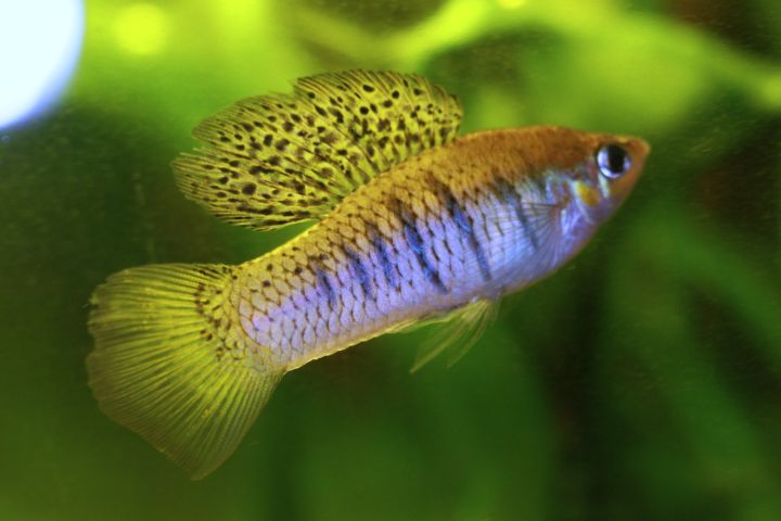 Description: Medium-sized swordtail with robust body; males reaching up to 6 cm and females up to 7 cm in total length. The species exhibits marked sexual dimorphism. Males display a metallic blue to violet sheen with prominent dark scale edges, creating a distinct reticulated pattern. They also have dark pattern consisting of oval vertical bars along the flanks. The dorsal fin is large, yellowish with dense black spotting, and the caudal fin is bright yellow. Males lack an extended caudal filament, sword is absent or < 1 mm long. Older males develop a distinct head bump. Females are more subdued in coloration, with a greyish-olive base color and a distinct dark lateral stripe running from the snout to the caudal peduncle.