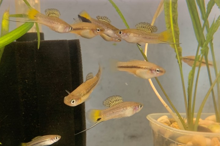 Description: Medium size, slender-bodied fish, exhibiting distinct sexual dimorphism. Males typically display a more vibrant colouration, with an iridescent body that transitions from light blue to yellow near the tail. The dorsal fin is often pale yellow, often with black pattern, while the caudal fin is a striking, bright yellow, frequently adorned with smaller and larger black spots. Females are generally more subdued in coloration, with a pale yellowish to brownish body and a bold dark lateral stripe running from the head to the tail.